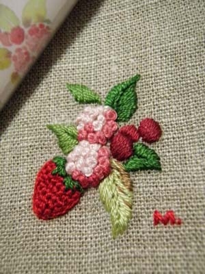 手帳の模様をアレンジしてベリーの刺しゅうを、赤系ばかりで少し立体的にしてみました。