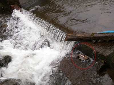 せっかくあがっても力つきた魚もいたりして、カラスがたくさん集まってます。