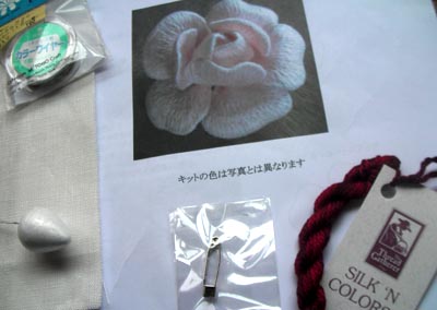キットが売られていたので、茶色のバラとさんざん迷って、赤いバラのコサージュのキットを買いました。一緒に行ったお友達はプリントリネンにちょこっと刺しゅうするブックカバーのキットを買っていました。