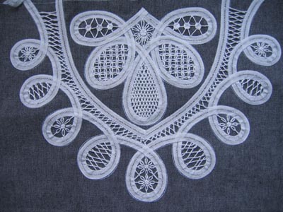 バテンレースのバックの裏側にイニシャルを入れようと思って、はぎれに試し刺し。