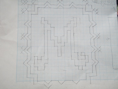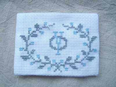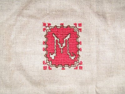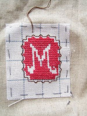 アッシジ刺しゅうのイニシャルをした普通な感じのバックを作りたいと思ったのですが、「J」しか本にはでていなかったので「M]を適当に作ってみました。