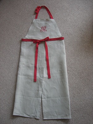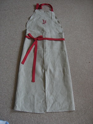 ポケットはいらないというので、胸当て部分は小さなサイズのキッチンクロスです。それでも幅が胸幅より大きいので両端を三角におりました。