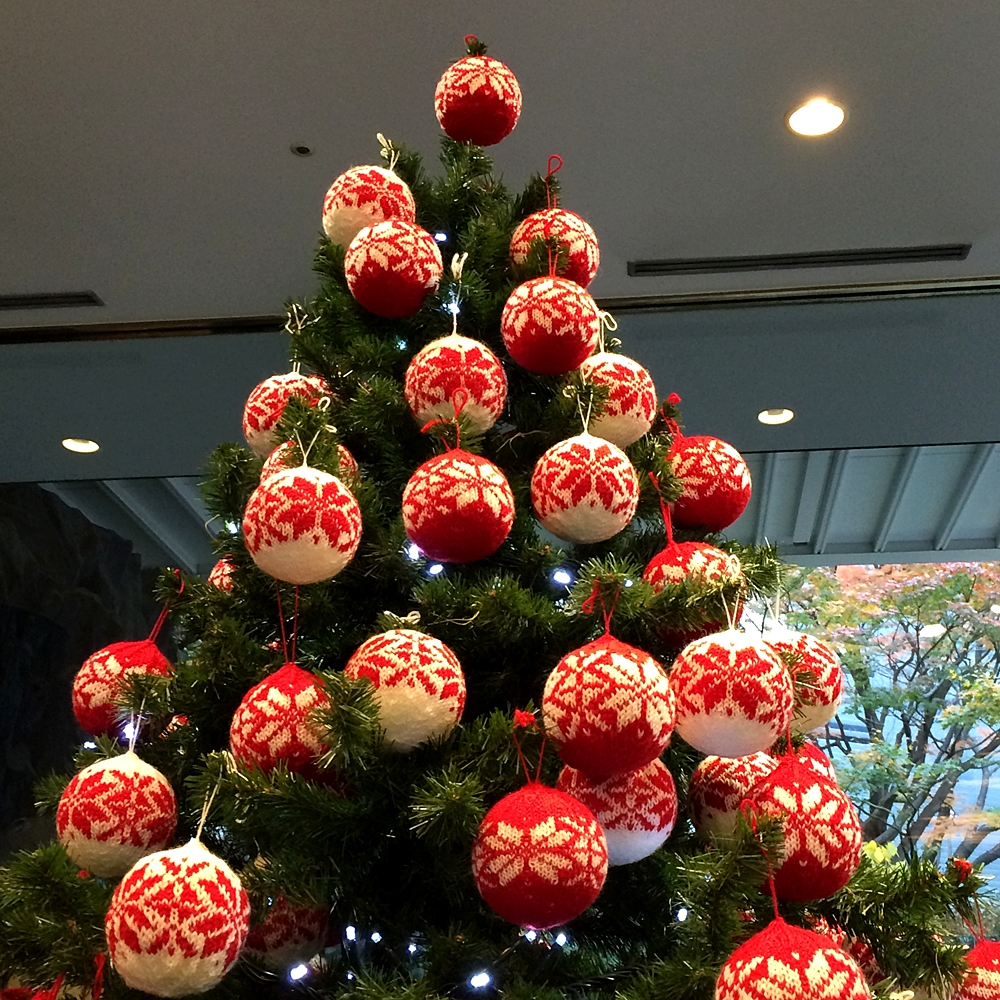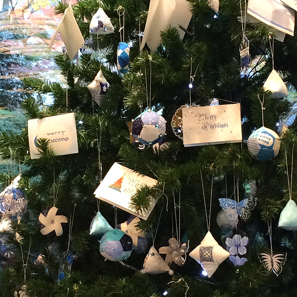 入り口のツリーも素敵。ニットやカリグラフィーの作品で飾られています。