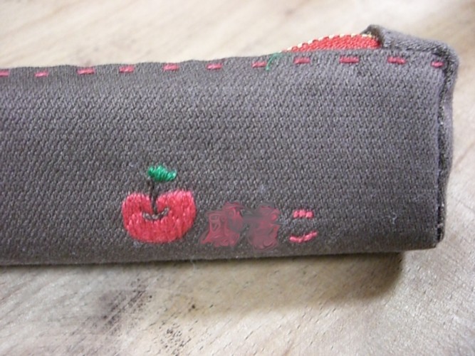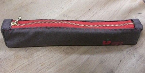 ホビーラホビーレのコットンラチネの茶にファスナーとあわせた赤(アンカー19番)が相性よくて、とってもかわいいです。ファスナー横にランニングステッチも入れました。
