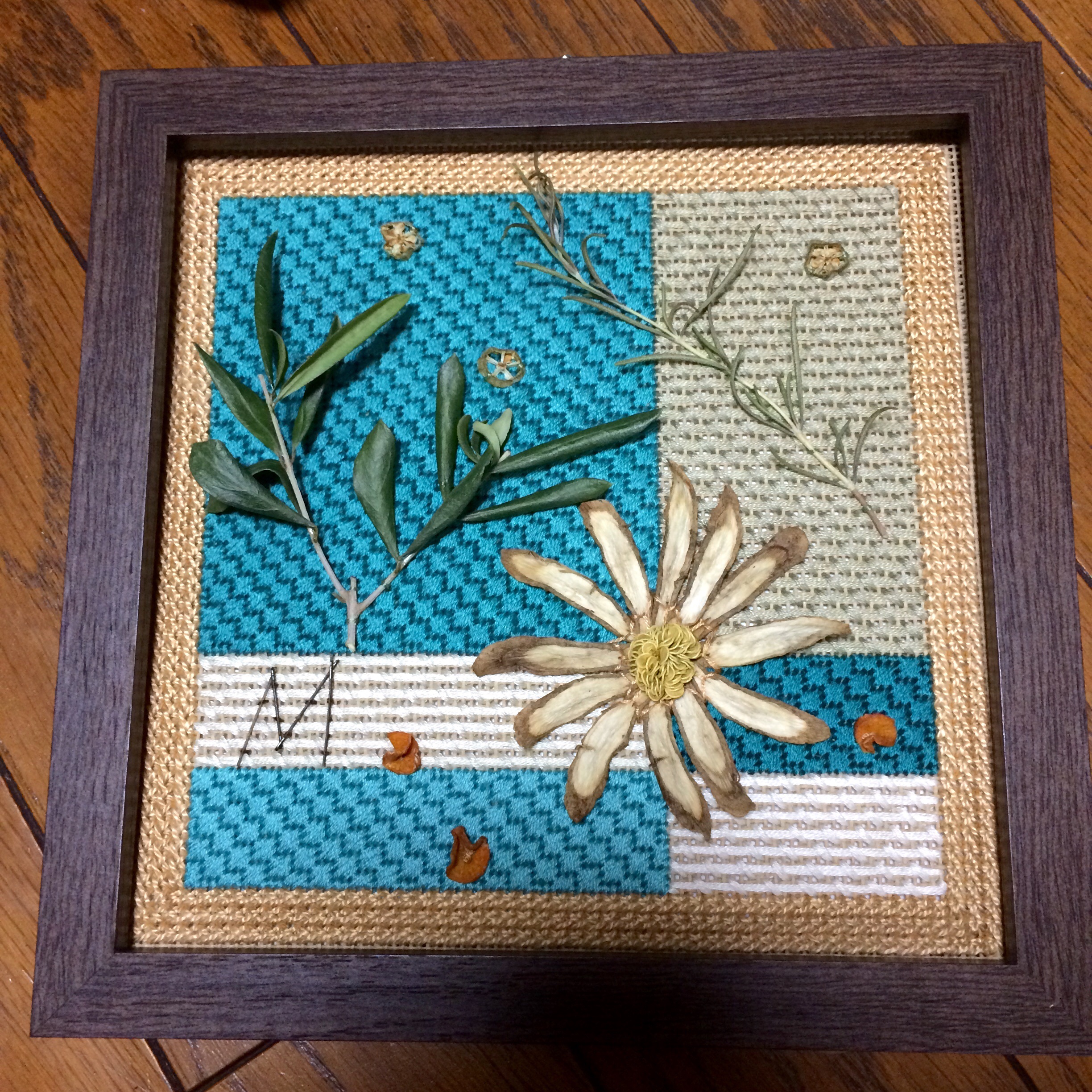 キャンバスワークで下刺しした上に、オリーブ、ローズマリー、ごぼう、にんじん、ピーマン、おくら