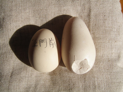 おじさんが「もう1個あるんだけど割れちゃったんだよね。」と細長い卵を見せてくれました。